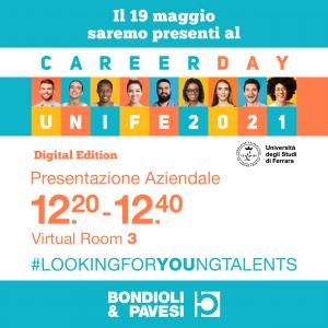 Mercoledì 19 maggio saremo presenti al Career Day Digital Edition 2021, l'appuntamento organizzato dall’Università degli Studi di Ferrara per far incontrare studenti e laureati con il mondo delle imprese.